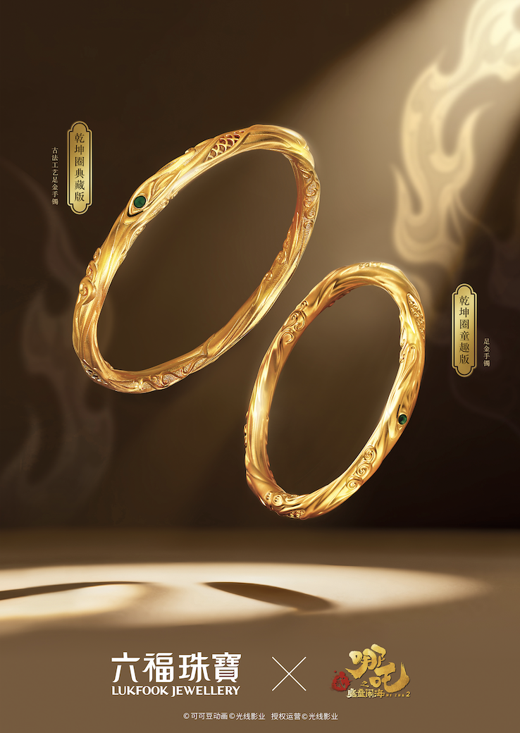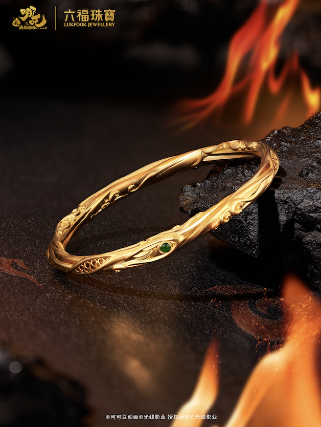 基于此,六福珠宝此次二度牵手“哪吒IP”,选取了电影《哪吒之魔童闹海》中具有代表性的哪吒、敖丙、乾坤圈、风火轮、混元珠等经典角色和元素,并运用传统古法制金工艺与硬足金鎏彩技术,将这些元素打造成多款璀璨华美、寓意丰富的足金首饰,也是对饰品的个性承载功能的深刻洞察。