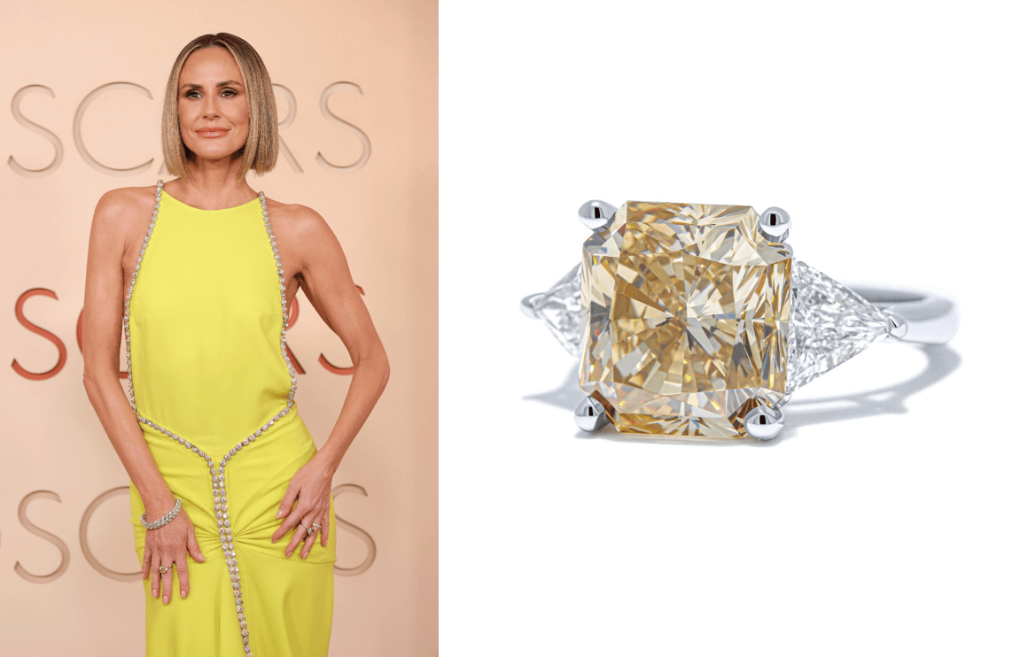 值得一提的是,除拜恩外,多位明星亦选择沙漠钻石点亮红毯造型。凯尔蒂·奈特(Keltie Knight)佩戴了全套Premier Gem珠宝:一枚烟熏棕黄色沙漠钻石戒指、一枚艳彩黄色明亮式切割天然钻石戒指,以及艳彩黄色阿斯切天然钻石垂坠耳环。