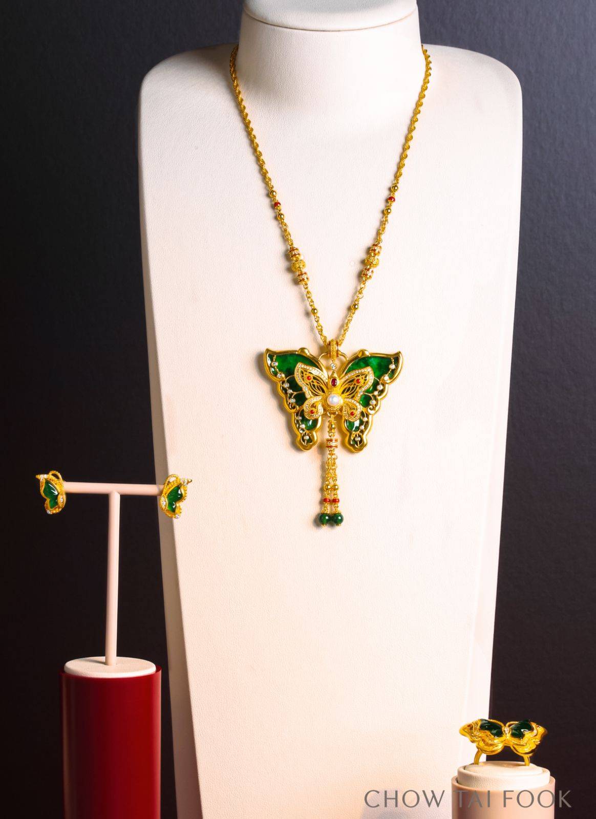 故宫系列另一新作“福蝶知春”以灵动翩跹之态落入视线。“福蝶知春”灵感源自故宫博物院藏宋代花鸟画代表作《海棠蛱蝶图》,作品以莹润翡翠雕琢为蝶翼,又以“福”为谐音,使蝴蝶于振翅间传递福运相伴的美好祝愿。同系列作品“玲珑花蝶”亦凝练此吉祥意向,于熠熠闪烁的金缕之间,向展厅中诸位宾客送上福运将至的真挚祝福。故宫系列另一款翡翠作品“福禄呈祥”撷取清·象牙雕大吉葫芦花囊为设计灵感,采用翠色欲流的晶莹翡翠,雕琢出葫芦的饱满形态。作品通过对文物中葫芦元素的提炼与重塑,生动诠释了中华传统美学与故宫文化的独特内涵。