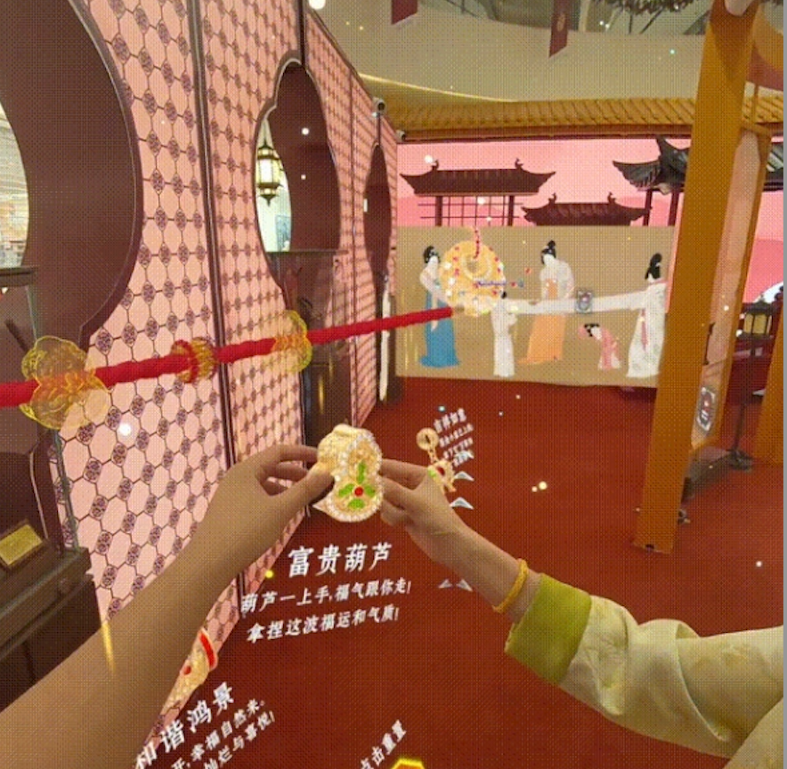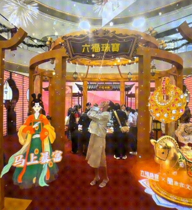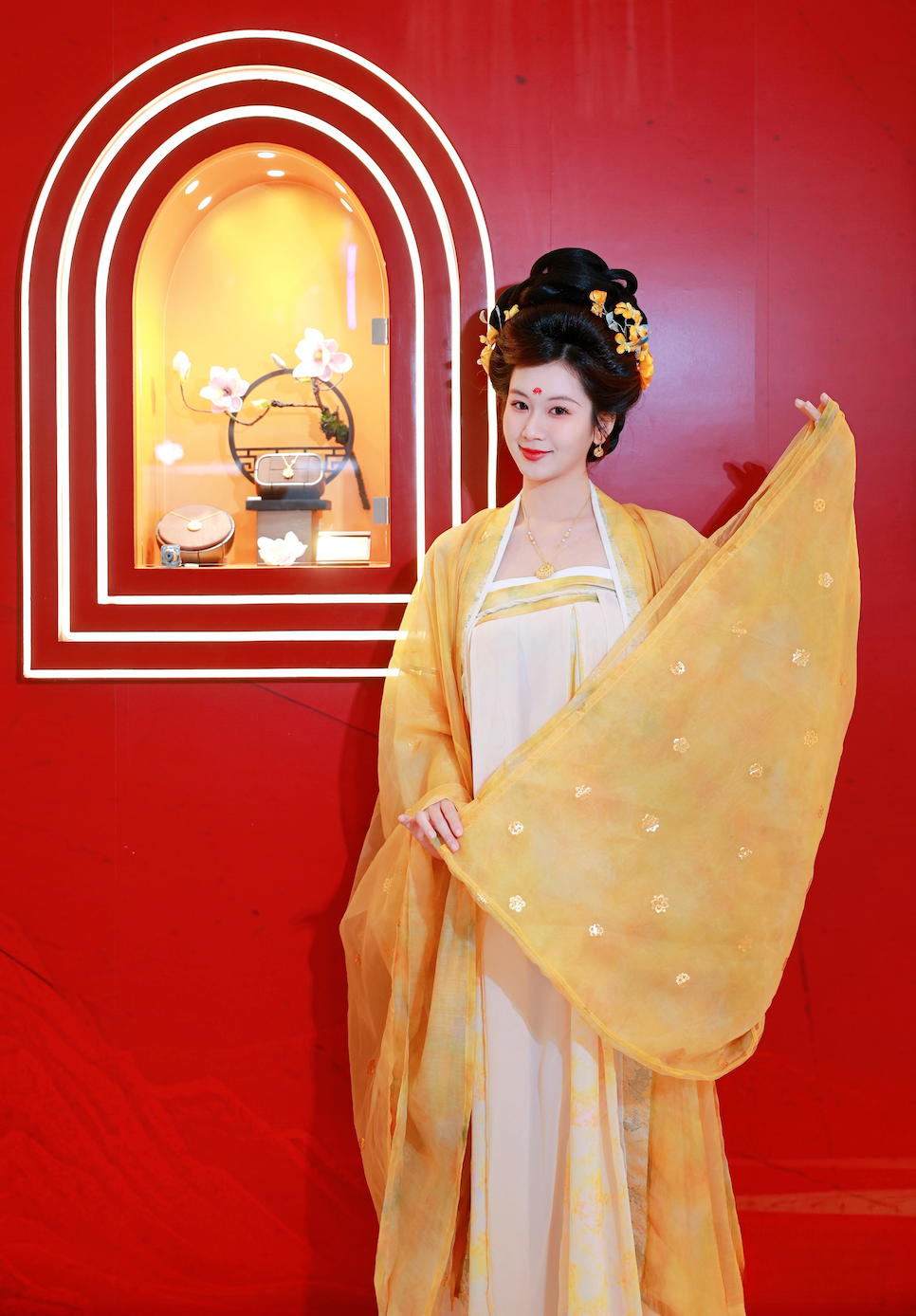 本次快闪店的核心亮点,在于六福珠宝首次将前沿的MR技术深度应用于珠宝展示与互动体验之中。消费者佩戴专用眼镜设备,即可通过特定区域互动装置,“亲眼目睹”唐代宫廷佳人从展区中翩然而出,与六福珠宝精美系列产品进行穿越时空的互动。璀璨的首饰在虚拟盛景中更显华贵,唐风古韵与现代设计交相辉映。