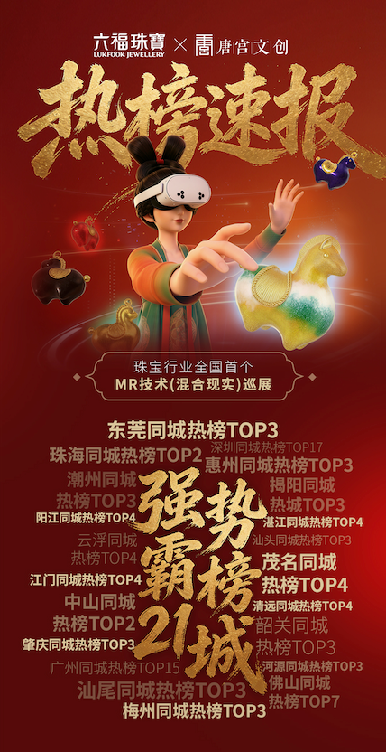 近日,一场传统与现代、文化与科技交融的营销盛宴在广东省东莞万象汇上演--知名珠宝品牌六福珠宝,携手现象级文化IP《唐宫夜宴》,打造了珠宝行业首个融入混合现实(MR)技术的主题快闪店,并联动本地社交媒体力量,成功上演了一场线上线下深度融合、声量与销量齐飞的“在地化营销”经典案例。活动不仅迅速引爆本地话题,更辐射大湾区21个城市,线下客流激增,销售业绩实现倍增,为珠宝行业探索新消费环境下的营销创新提供了鲜活样本。
