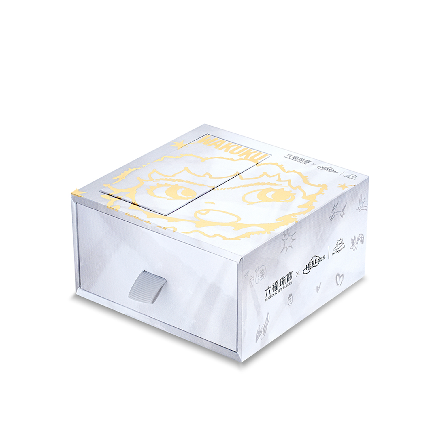 凡选购WAKUKU系列任意首饰,可获赠六福珠宝×WAKUKU专属联名礼盒一份,随即解锁这场黄金时尚Party的惊喜彩蛋:抽拉式机关轻巧一推,礼盒如魔法宝匣般展开,潮玩卡片随之翻动,长着一字眉、大圆眼和小虎牙的WAKUKU跃然眼前,萌酷值拉满!翻页不止,乐趣不停,精美礼盒化身快乐魔盒,为每一件首饰的购入注入满满仪式感,愿玩趣与好运持续加载,希望生活处处绽放“金”喜火花。这个在明星街拍里频繁出镜的IP,正等待着被你认领,一起将普通日常装扮升级,加入这场潮酷派对!