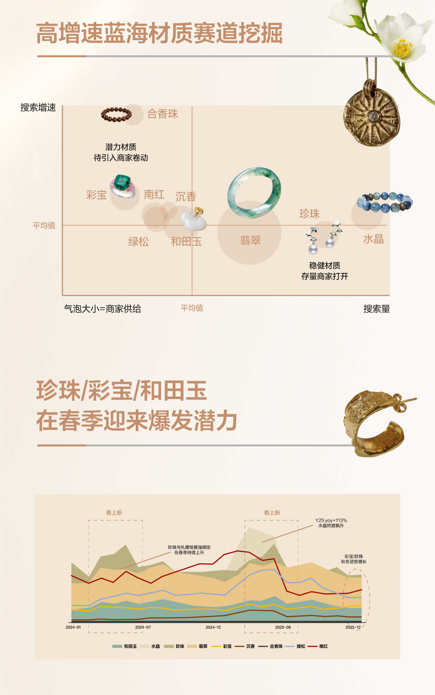 在这一情感升级浪潮下,材质选择成为了情绪表达的直接载体,以“珍珠、彩宝、和田玉”为主的典型类别,在种草场景&潜在人群上更加细分。珍珠的温润光泽,承接都市女性对松弛感的渴望;彩宝的视觉张力,成为打破沉闷、宣泄个性的出口;而和田玉的东方雅韵,则回应年轻一代对文化归属与内心宁静的追寻。如何透过趋势捕捉机会人群底层需求,成为品牌现阶段的重要课题。